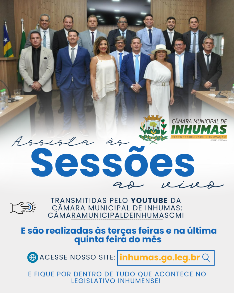 As Sessões da Câmara Municipal de Inhumas são transmitidas ao vivo pelo YouTube e acontecem todas as terças-feiras e na última quinta-feira de cada mês.